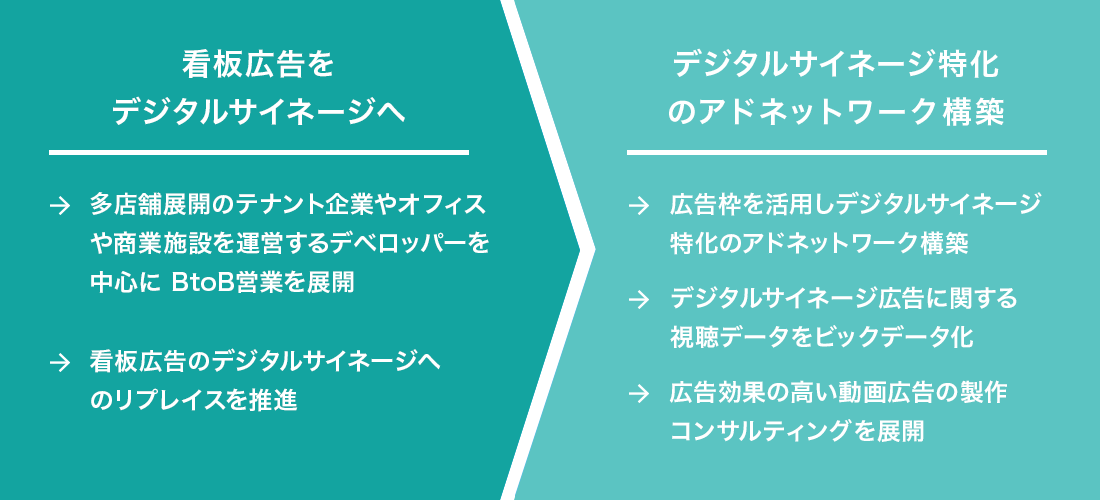 デジタルサイネージ事業は多店舗展開のテナント企業やオフィス・商業施設を運営する企業へのデジタルサイネージ販売を主力事業としており、看板広告からデジタルサイネージへのリプレイスを推進します。
