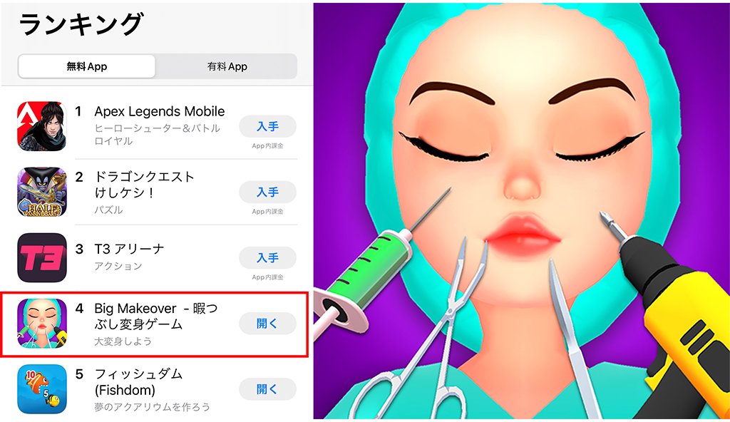 2022.05.31 お知らせハイパーカジュアルゲームアプリ「Big Makeover」がApp Store(無料ゲーム)ランキングにて日米ともにランキング上位に
