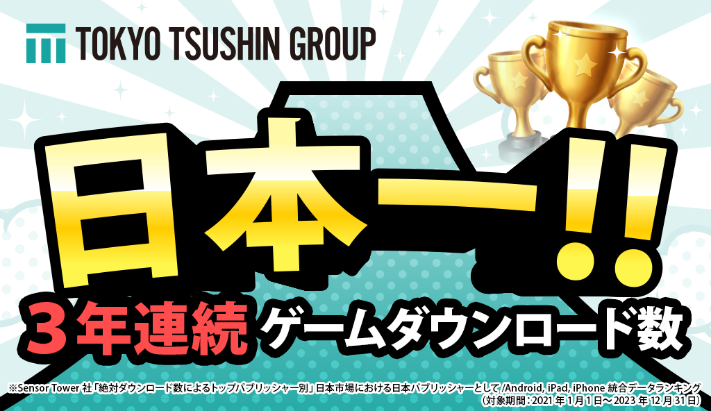 株式会社東京通信グループ(本社:東京都港区、代表取締役社長CEO:古屋 佑樹、証券コード:7359、以下、当社)が、Sensor Tower社スマートフォンアプリ統計データ「2023年のゲームダウンロード数ランキング(日本市場/Android, iPad, iPhone統合データ)」において第1位にランクイン※し、日本パブリッシャー(配信会社)として2021年から3年連続で日本一を獲得※したことをお知らせいたします。